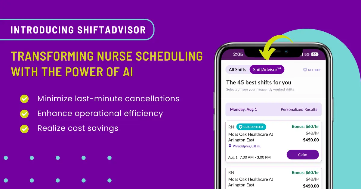 McLean, Va. – January 9, 2023 - ShiftMed, the leader in on-demand workforce technology, announces today the launch of ShiftAdvisor, a new AI-powered feature set to transform nurse scheduling and elevate the staffing efficiency of healthcare facilities. This solution is designed to benefit both healthcare professionals (HCPs) and facilities by optimizing shift scheduling, ensuring providers find the best shifts with minimal cancellation risks, and simultaneously enabling facilities to achieve optimal staffing levels.